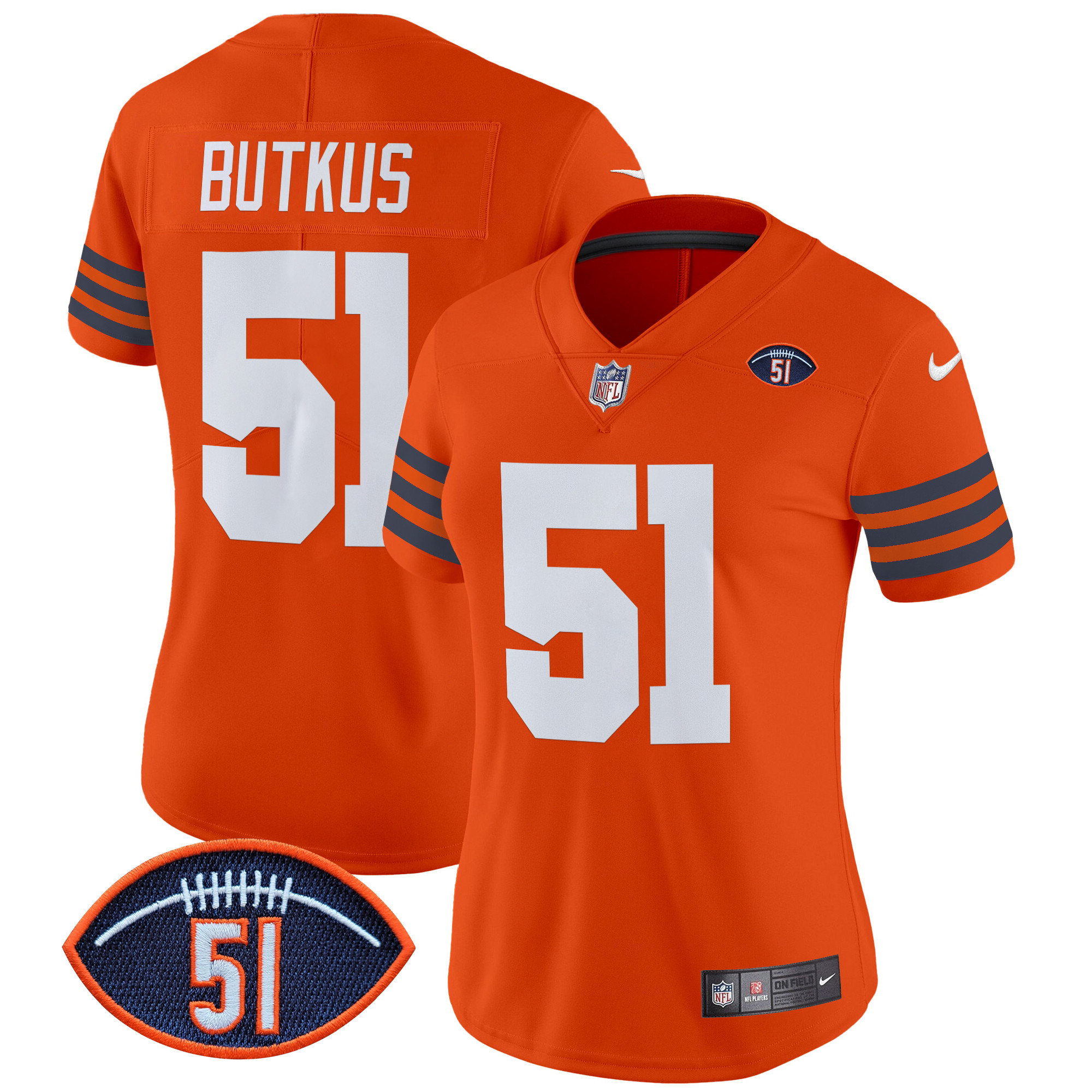 Brian Urlacher Women’s Chicago Bears Dick Butkus Patch Throwback Vapor Limited Orange Jersey – All Stitched