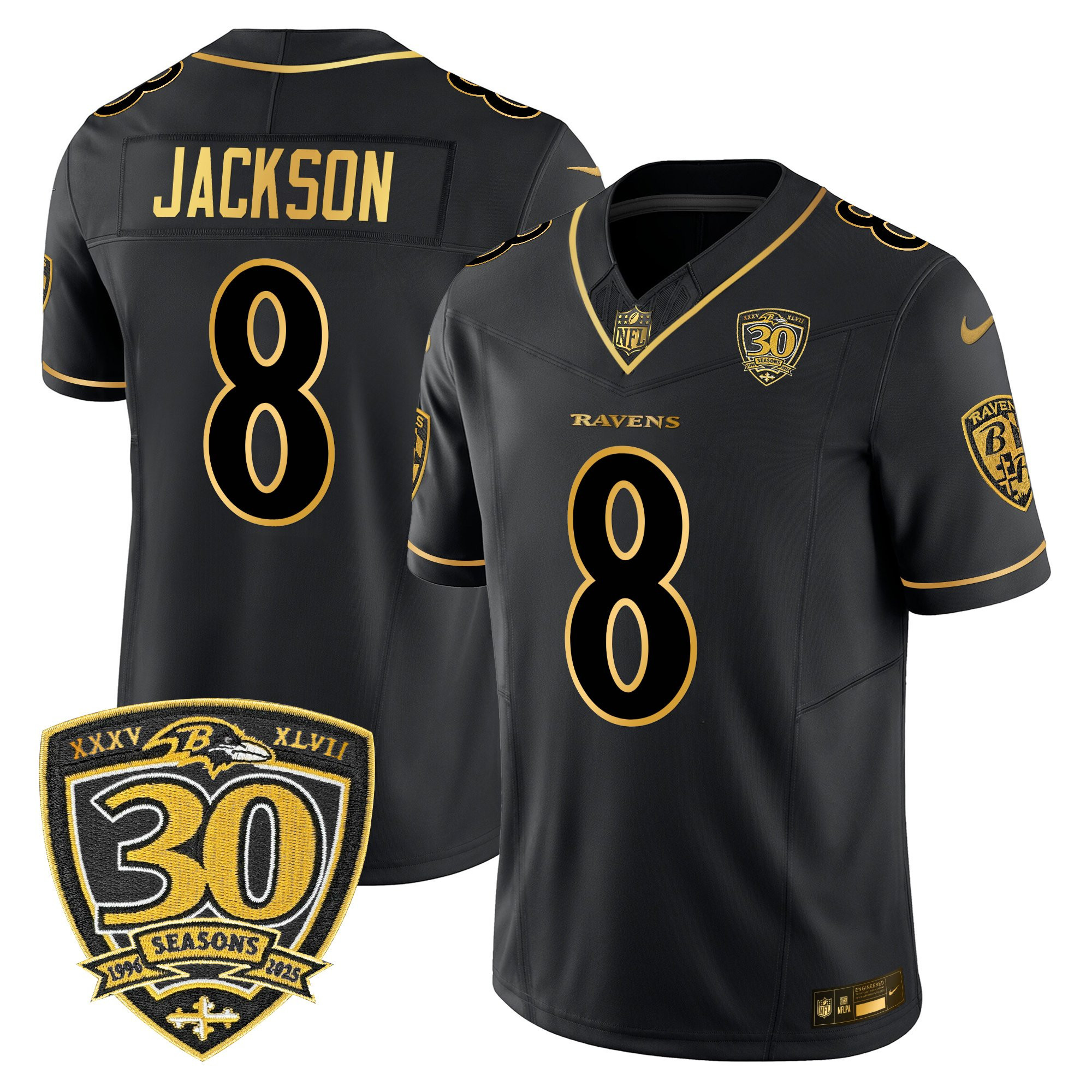 Charm City 410 Men’s Baltimore Ravens 2025 Gold Vapor Limited Black Gold Jersey – 30th Anniversary Patch – All Stitched