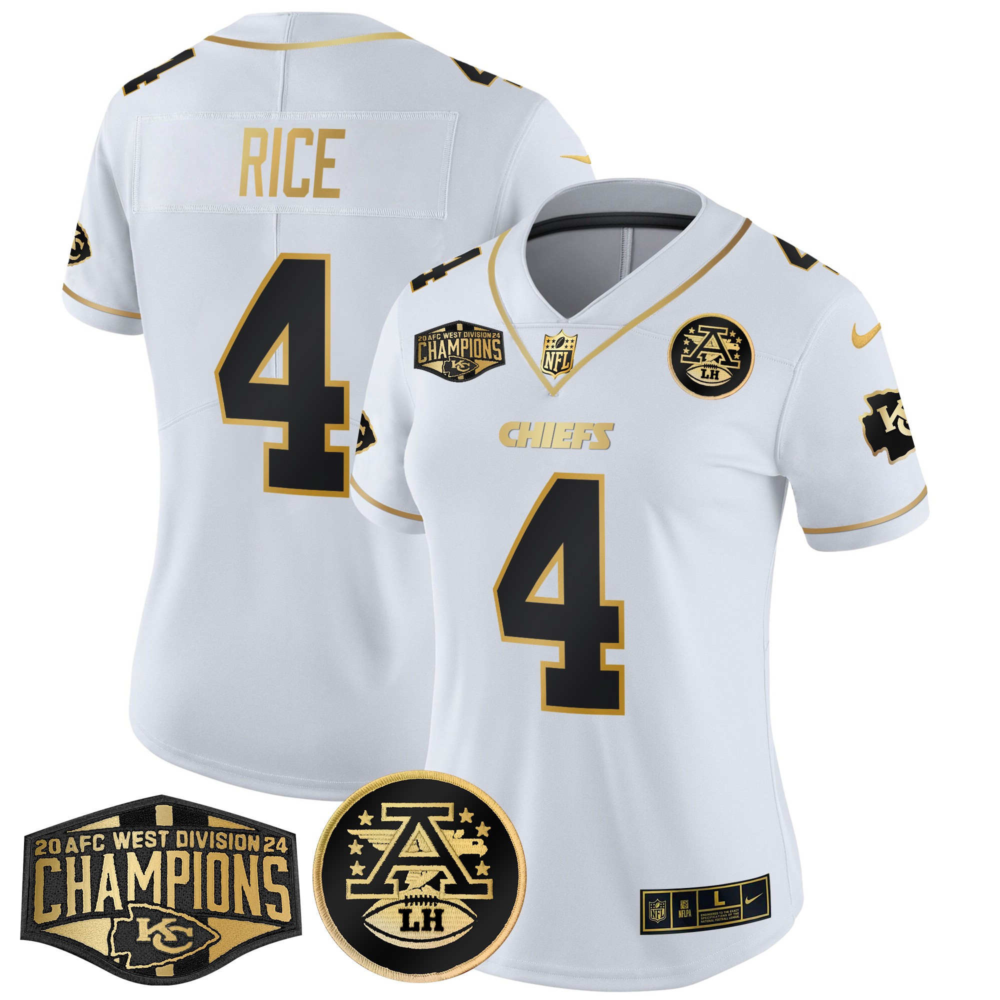 Donald Trump Women’s Kansas City Chiefs 2024 AFC West Division Champions Patch Gold Vapor Limited White Gold Jersey – All Stitched