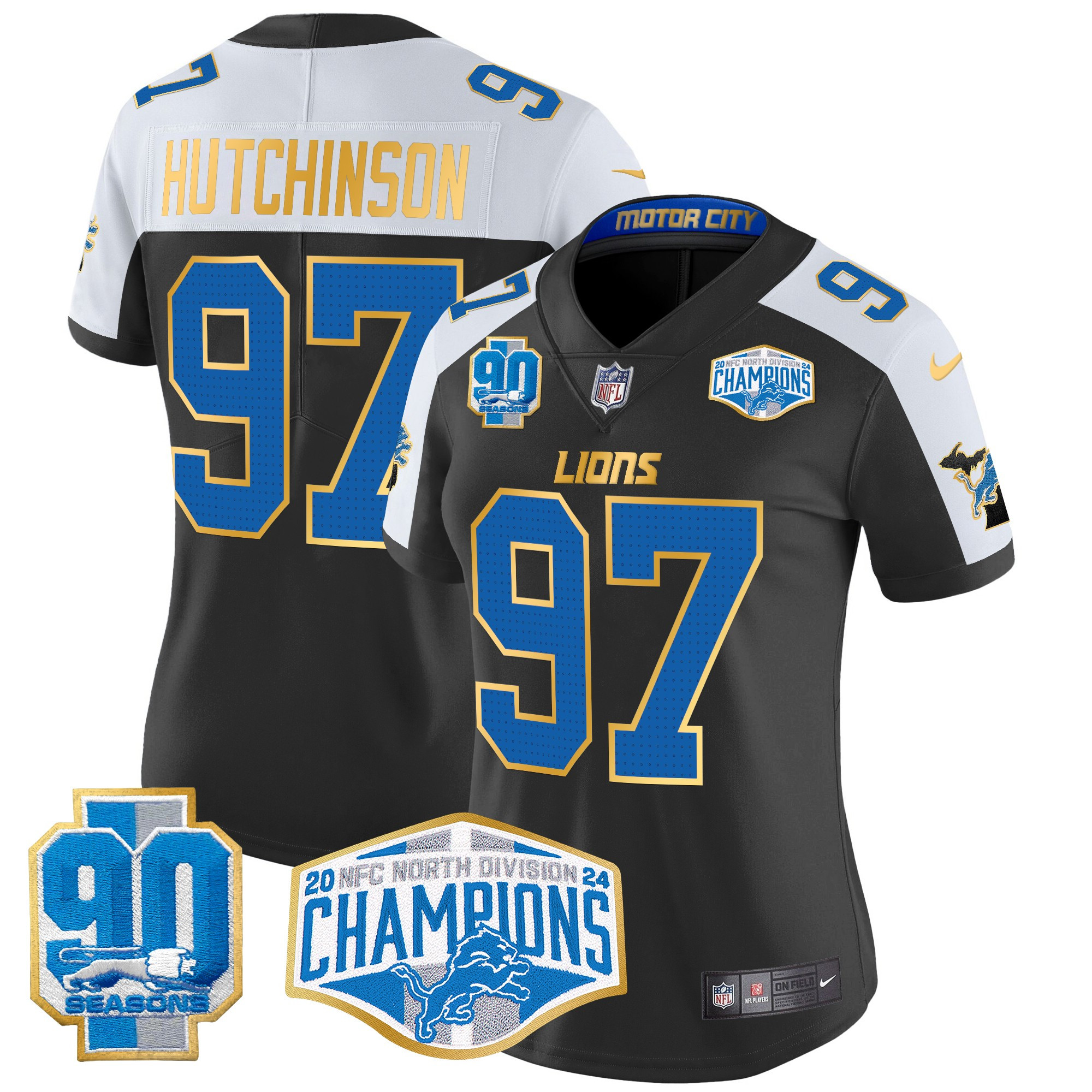 Jared Goff Women’s Detroit Lions 2024 NFC North Division Champions Patch Gold Trim Vapor Limited Black Alternate Jersey – All Stitched