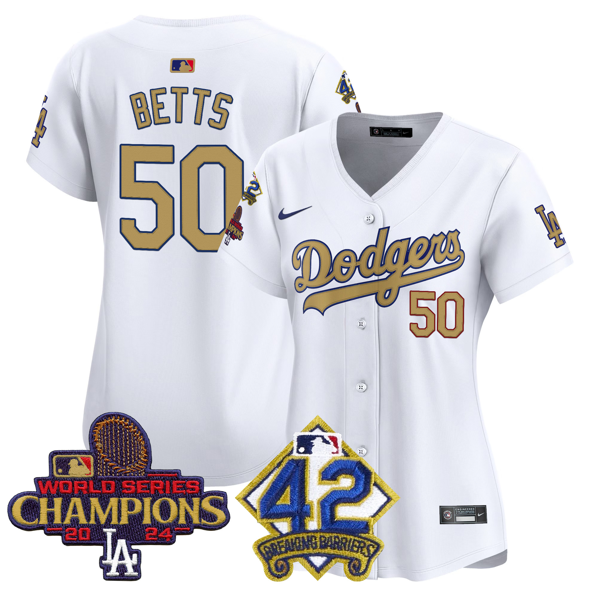 Mookie Betts Women’s Los Angeles Dodgers 2024 World Series Champions & Jackie Robinson Patch Vapor Premier Limited White Jersey – All Stitched