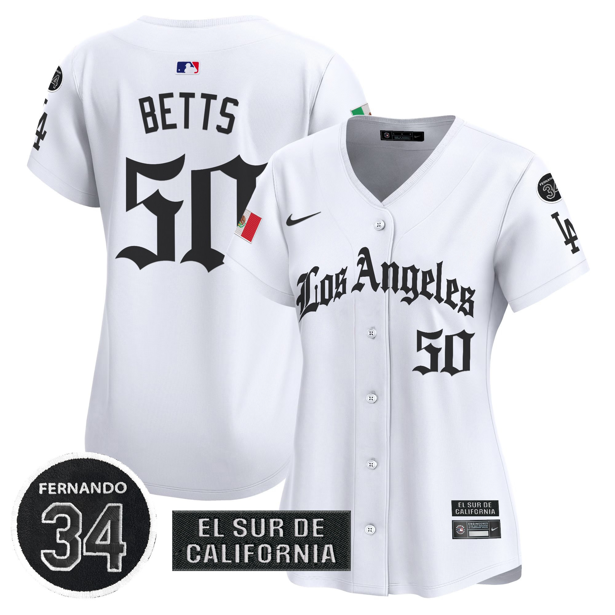 Mookie Betts Women’s Los Angeles Dodgers Mexico 2025 LA Gothic Style Vapor Premier Limited White Jersey – All Stitched