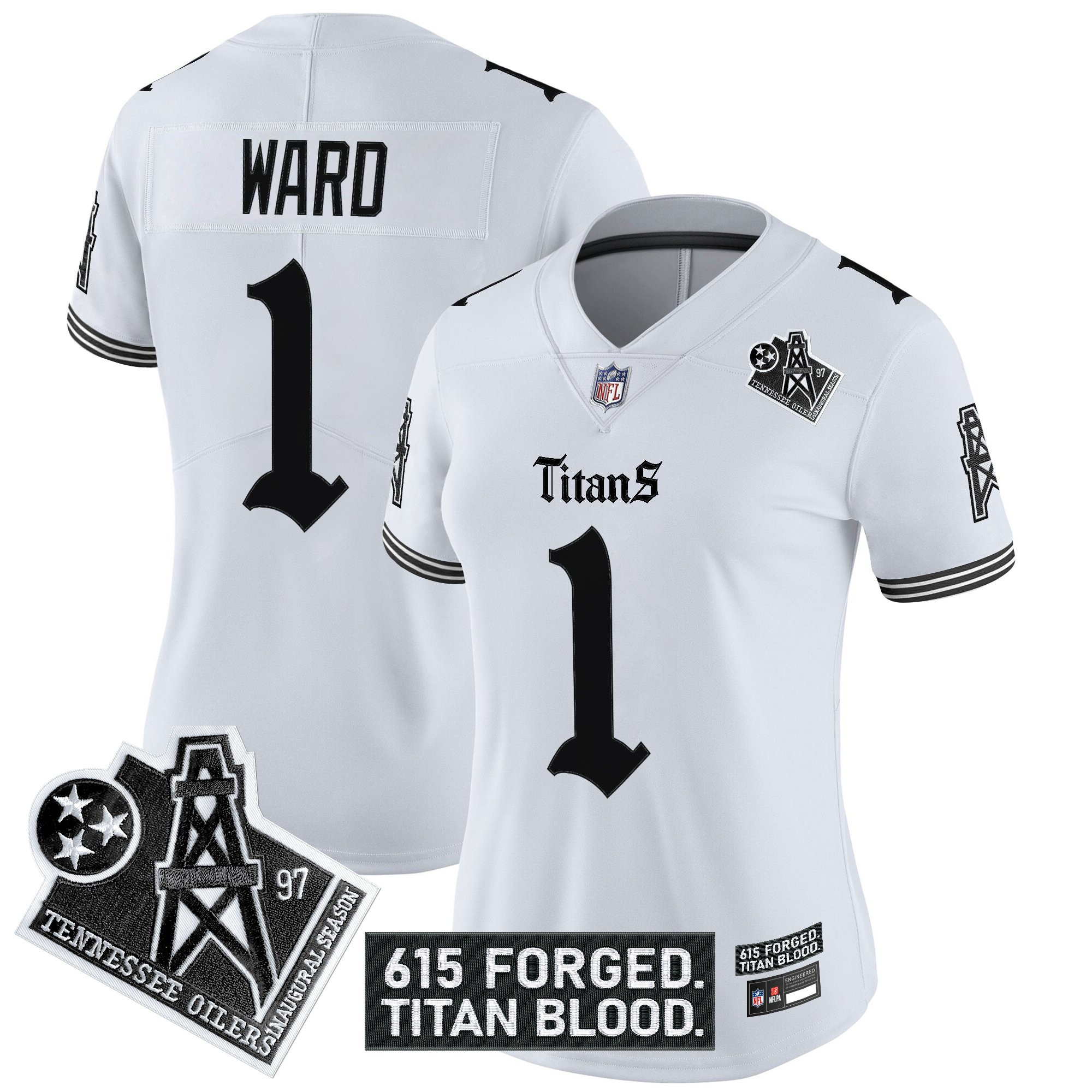 Music City 615 Women’s Tennessee Titans ‘Titan Gothic Shadows Drop’ Vapor Limited White Jersey – All Stitched