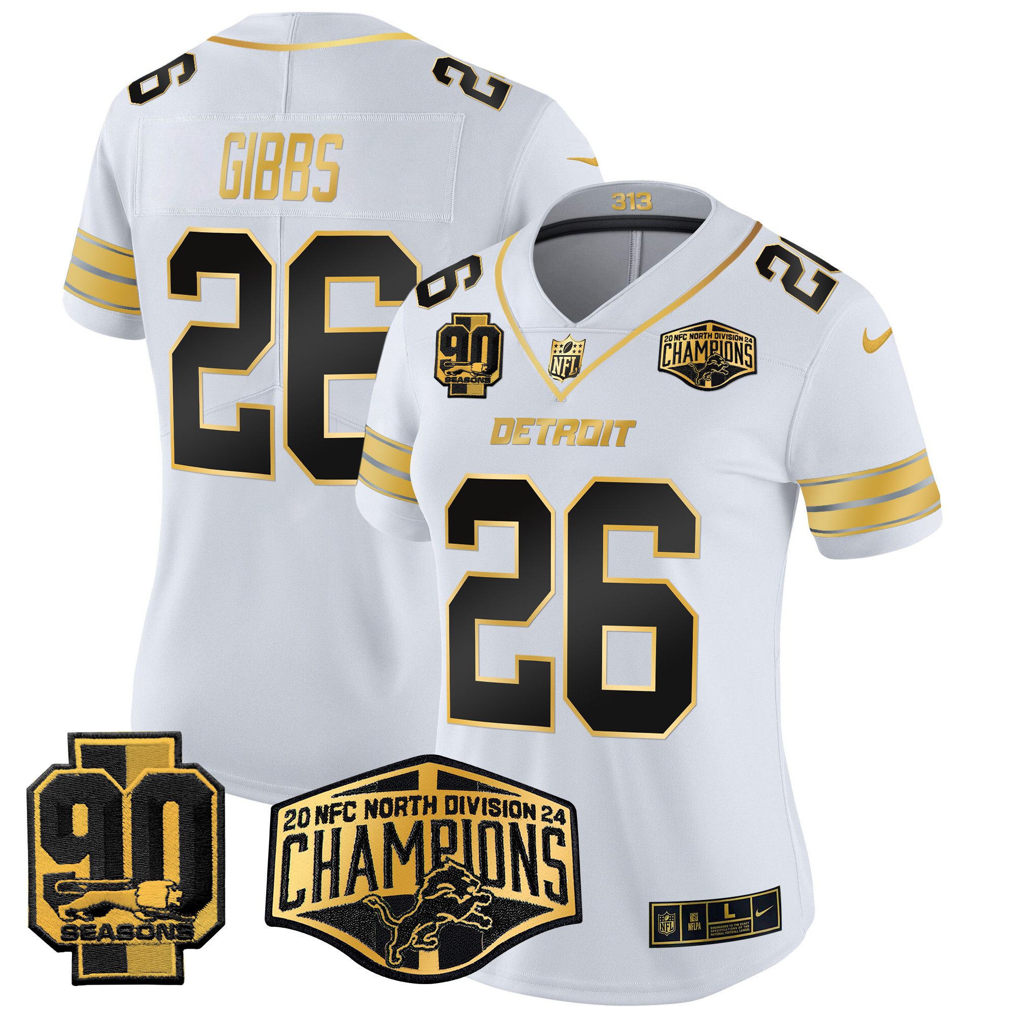 Sam Laporta Women’s Detroit Lions 2024 NFC North Division Champions Patch Gold Vapor Limited White Gold Jersey – All Stitched