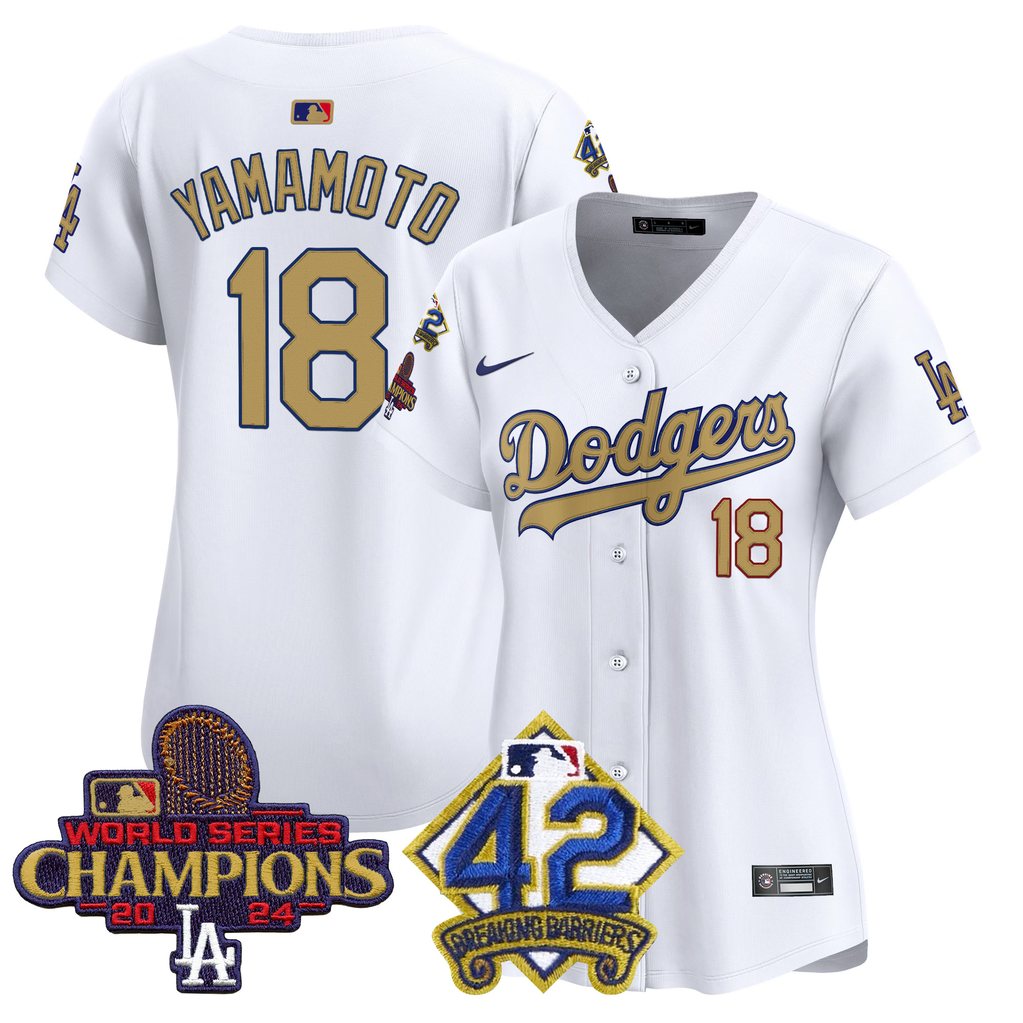 Shohei Ohtani Women’s Los Angeles Dodgers 2024 World Series Champions & Jackie Robinson Patch Vapor Premier Limited White Jersey – All Stitched