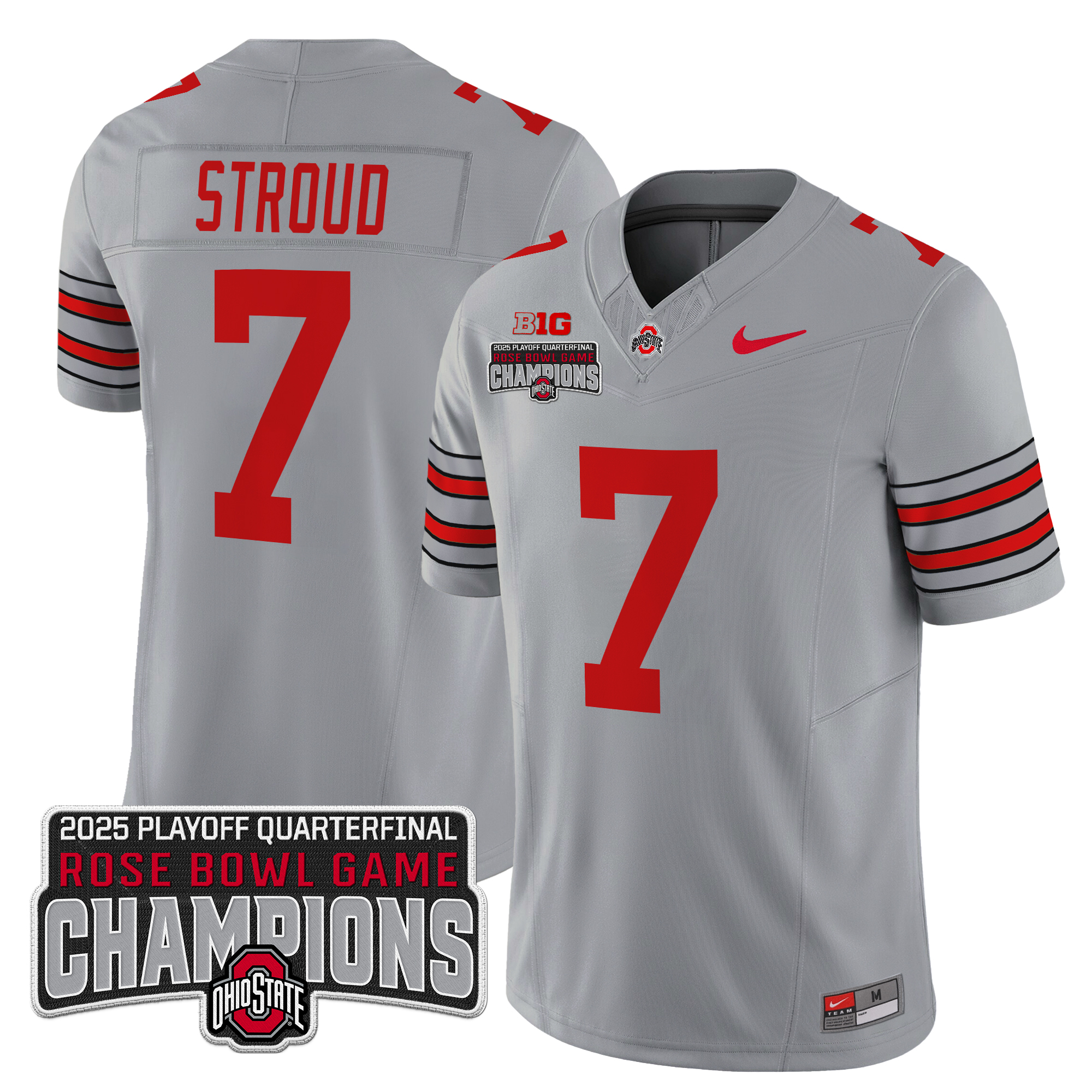 Treveyon Henderson Men’s Ohio State Buckeyes ‘Heritage Stripe’ 2025 Playoff Rose Bowl Champions Patch Vapor Limited Gray Jersey – All Stitched