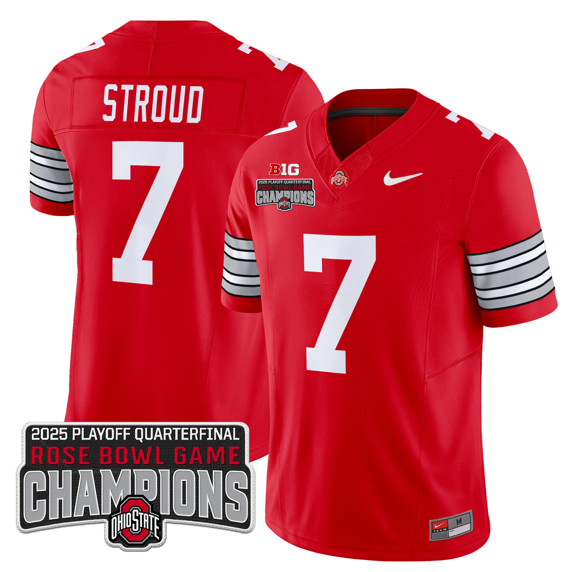 Treveyon Henderson Men’s Ohio State Buckeyes ‘Heritage Stripe’ 2025 Playoff Rose Bowl Champions Patch Vapor Limited Red Jersey – All Stitched