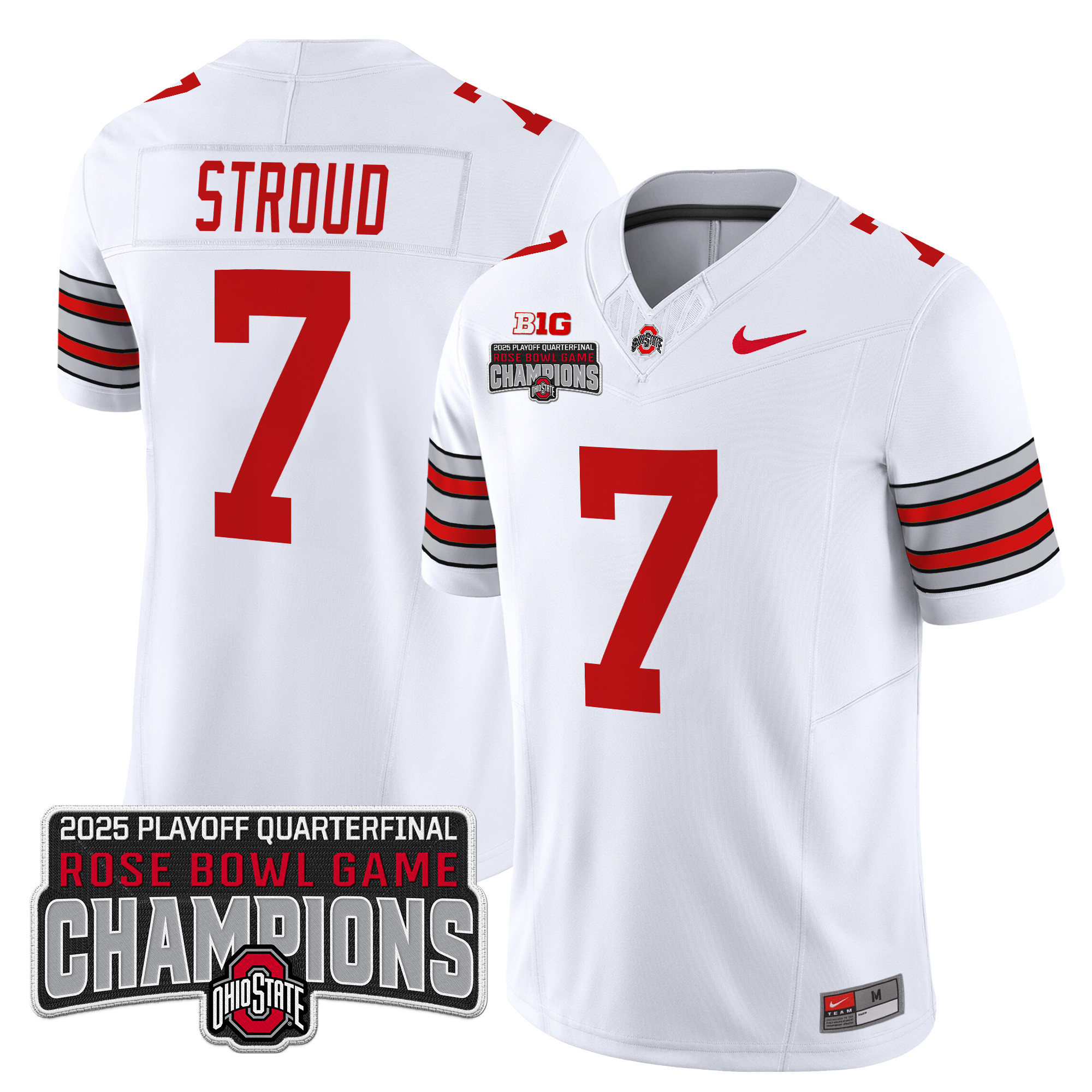 Treveyon Henderson Men’s Ohio State Buckeyes ‘Heritage Stripe’ 2025 Playoff Rose Bowl Champions Patch Vapor Limited White Jersey – All Stitched
